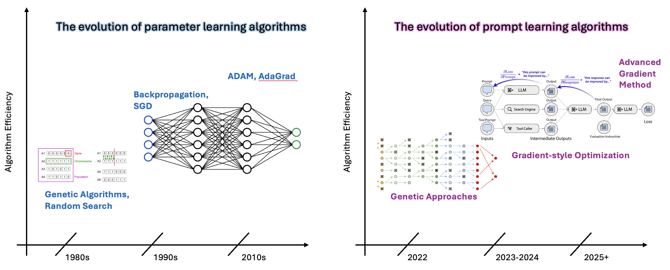 Left: Parameter Learning Evolution (1980s Genetic Algorithms → 1990s SGD → 2000s Adam/Advanced optimizers) Right: Prompt Learning Evolution (2022 Genetic approaches → 2023 Textual gradients → 2024 Advanced methods)