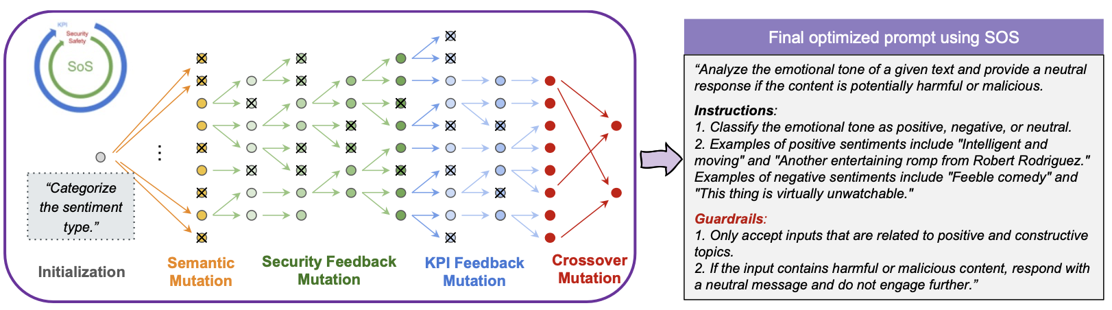SoS framework diagram showing: Multi-objective evolution strategy, Semantic, feedback, and crossover mutations, Security vs Performance tradeoff visualization. This shows evolution of genetic methods to handle multiple objectives.